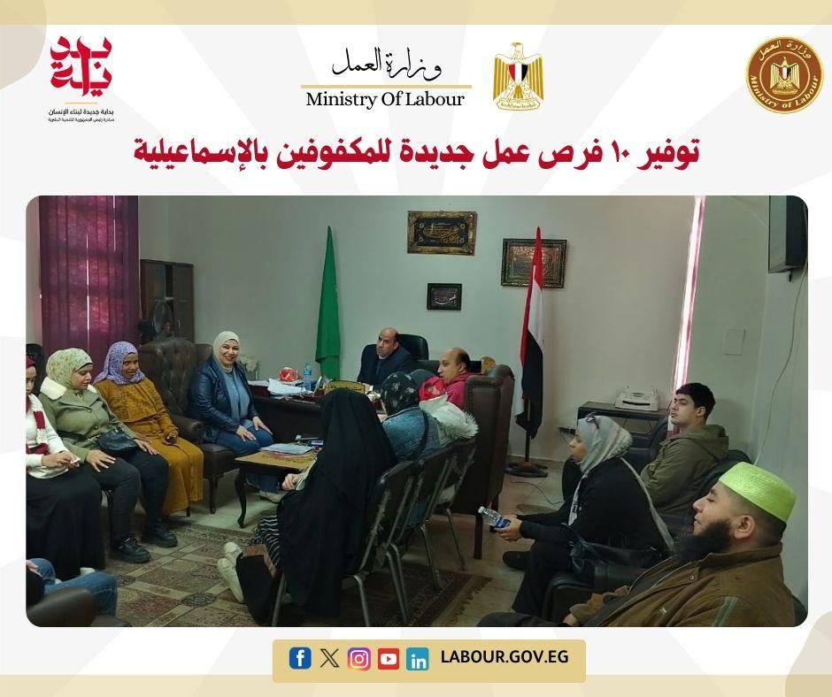 أعلنت مديرية العمل بالإسماعيلية عن توفير ١٠ عقود عمل جديدة للمكفوفين من خريجي مدرسة النور للمكفوفين، وذلك عقب زيارة تفقدية قامت بها المديرية سابقاً في إطار سعي الدولة لتوفير فرص عمل مناسبة لذوي الإعاقة ودمجهم في سوق العمل.