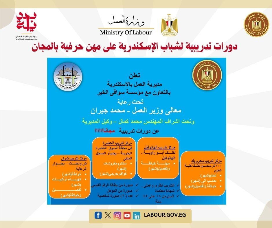 أعلنت مديرية عمل الإسكندرية عن بدء التسجيل الإلكتروني للدفعة الأولى من الدورات التدريبية التي تنظمها المديرية في المراكز المهنية التابعة لها، حيث يتم تنفيذ دورات في تخصصات (لحام، حاسب آلي، خياطة وتفصيل) بمركز تدريب مهني محرم بك، ودورات في تخصصات (خراطة - كهرباء تركيبات - خياطة وتفصيل) بمركز تدريب مهني شرق على إلى جانب دورات في تخصصات (ستائر ومفروشات - كوافير حريمي ) بمركز تدريب الحضرة ودورات في تخصص (التفصيل والخياطة) بمركز تدريب مهني الهانوفيل. وأشار المهندس محمد كمال وكيل المديرية إلى أن تلك التدريبات تأتي تنفيذاَ للبرتوكول المبرم بين مديرية العمل بالإسكندرية ومؤسسة سواقي الخير للتدريب والتطوير وتنمية المجتمع، في إطار الجهود التي تبذلها الدولة من خلال وزارة العمل وفي ظل الاستراتيجية الوطنية للتشغيل في مجال تشغيل الشباب وخلق فرص عمل حقيقية لهم وتمكينهم اقتصاديا.وأضاف وكيل المديرية أن التدريب سيتم خلال الفترة الصباحية من الساعة 9 صباحاً إلى 1 ظهراً، على مدار 5 أيام في الأسبوع لمدة شهر، حيث سيحصل المتدربون في نهاية كل دورة تدريبية على شهادة معتمدة من الطرفين، ويمكن التسجيل بالتوجه إلى مقر المديرية الكائنة خلف نقابة الأطباء سموحة أو عن طريق الرابط التالي : https://forms.gle/7aEJwkdstj7rszGBA