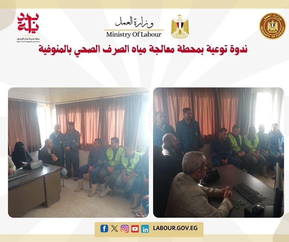 عقد مكتب السلامة والصحة المهنية بأشمون التابع لمديرية العمل بالمنوفية ندوة توعوية لعدد ٢٠ عامل من العاملين بمحطة معالجة مياه الصرف الصحي بأشمون، وذلك في تنفيذاً لتوجيهات السيد محمد جبران وزير العمل بالتوعية بأهمية السلامة والصحة المهنية والوقاية من المخاطر والتعامل مع الإصابات.
