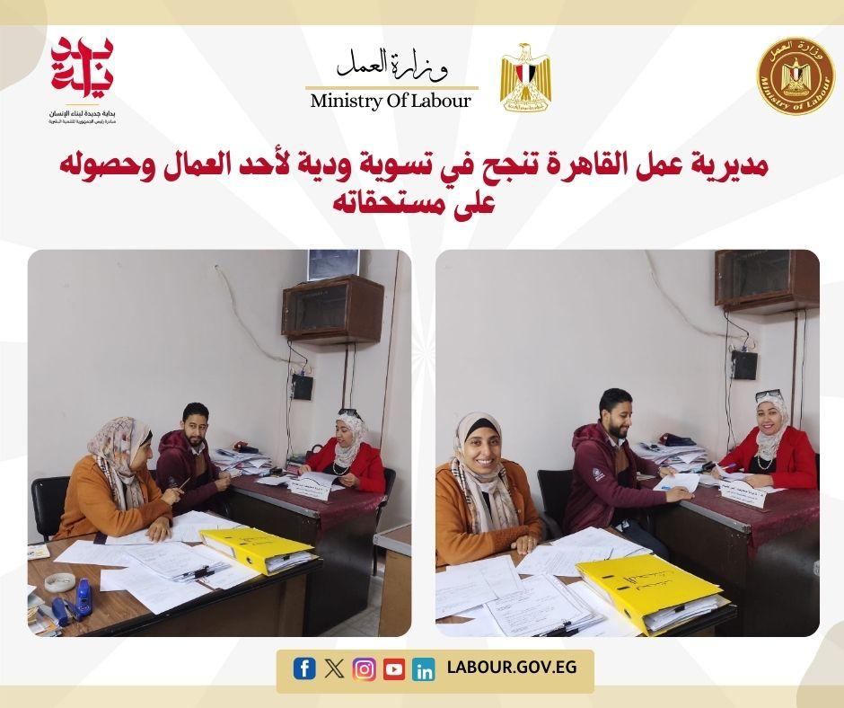 أعلنت مديرية العمل بمحافظة القاهرة عن نجاح عملية تسوية وديّة بمكتب علاقات العمل 15 مايو والتبين والمعادي، مع مدرسة رواد المستقبل،دون اللجوء إلى القضاء، وذلك بعد تقديم العامل حسام الدين جمال عبد الوهاب بشكوى للمطالبة بحقوقه المالية، حيث أسفرت المفاوضات عن حصوله على مستحقاته المالية ومكافأة الامتحانات ونصف شهر عمل ومسوغات التعيين.وأوضح أحمد عزاز مدير مديرية العمل بالقاهرة، أن هذه الجهود تأتي في إطار تنفيذ توجيهات وزير العمل محمد جبران، بتعزيز علاقات العمل بين طرفي الإنتاج وتطبيق أحكام القانون، مؤكداً على أهمية دور مكاتب علاقات العمل في التوصل إلى حلول سلمية للخلافات من خلال المفاوضات والتسويات الودية وتعزيز علاقات العمل بين طرفي العملية الإنتاجية، أجريت المفاوضات بحضور مي أحمد مدير مكتب العلاقات ودينا محمد إبراهيم مفتش المكتب.