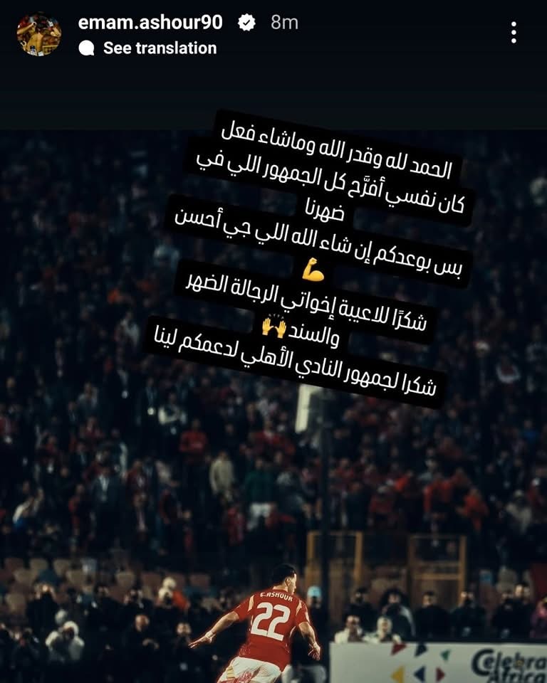 وكتب إمام عاشور عبر حسابه الرسمي على موقع انستجرام: "الحمد لله وقدر الله ما شاء فعل، كان نفسي أفرح كل الجمهور اللي في ضهرنا".