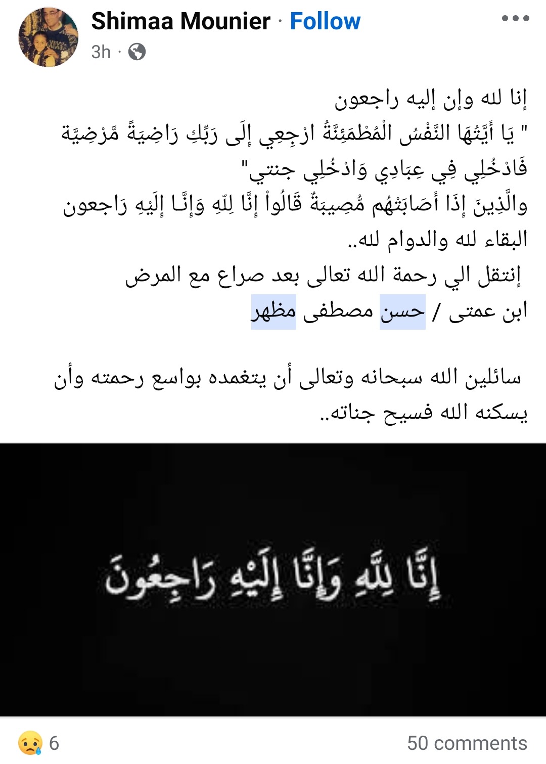 وكتبت: "إنا لله وإن إليه راجعون، يَا أَيَّتُهَا النَّفْسُ الْمُطْمَئِنَّةُ ارْجِعِي إِلَى رَبِّكِ رَاضِيَةً مَّرْضِيَّة فَادْخُلِي فِي عِبَادِي وَادْخُلِي جنتي .. والَّذِينَ إِذَا أَصَابَتْهُم مُّصِيبَةٌ قَالُواْ إِنَّا لِلّهِ وَإِنَّـا إِلَيْهِ رَاجعون البقاء لله والدوام لله".