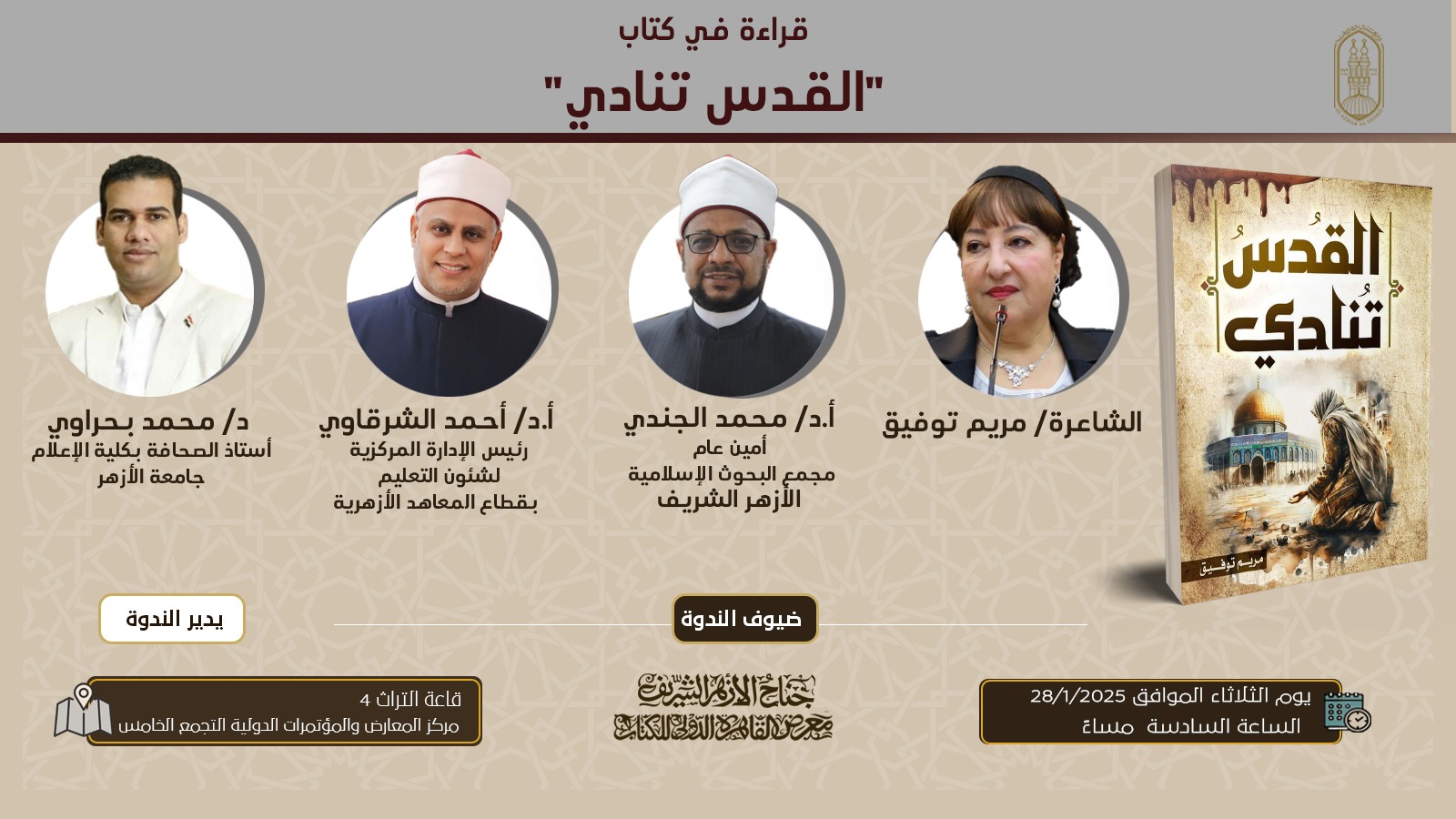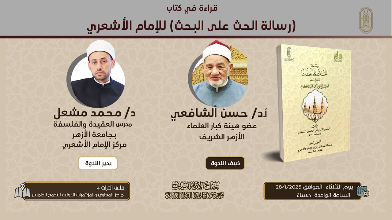 كما يعقد جناح الأزهر ندوة قراءة في كتاب "رسالة الحث على البحث" للإمام الأشعري، ويحاضر فيها أ.د/ حسن الشافعي عضو هيئة كبار العلماء بالأزهر، ويدير الندوة الدكتور محمد مشعل مدرس العقيدة والفلسفة بجامعة الأزهر، بالإضافة إلى ندوة بعنوان: "قراءة في كتاب القدس تنادي"، التي يحاضر فيها أ.د/ محمد عبد الدايم الجندي، أمين عام مجمع البحوث الإسلامية، وأ.د/ أحمد الشرقاوي، رئيس الإدارة المركزية لشئون التعليم بقطاع المعاهد الأزهرية، والشاعرة مريم توفيق، ويديرها الدكتور محمد البحراوي، أستاذ الصحافة بكلية الإعلام جامعة الأزهر.