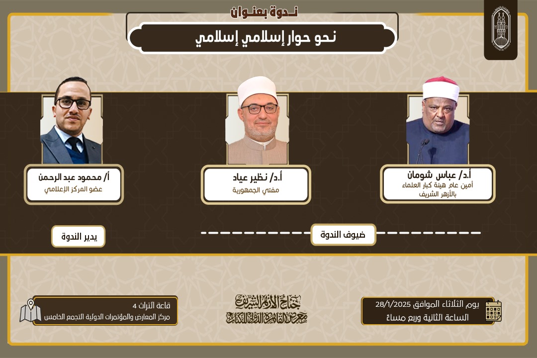 ضمن فعاليات معرض القاهرة الدولي للكتاب في دورته الـ 56، يعقد جناح الأزهر الشريف غدًا الثلاثاء، عدة ندوات مهمة، منها ندوة "نحو حوار إسلامي ـ إسلامي" بمشاركة فضيلة الأستاذ الدكتور نظير عياد، مفتي الجمهورية، والأستاذ الدكتور عباس شومان، أمين عام هيئة كبار العلماء بالأزهر الشريف، ويديرها الإعلامي محمود عبد الرحمن عضو المركز الإعلامي لمشيخة الأزهر.