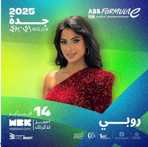روجت الفنانة روبي لحفلها القادم المقرر إقامته بالمملكة العربية السعودية ضمن فعاليات بطولة لـ"فورمولا إي" وذلك يوم 14 فبراير القادم .