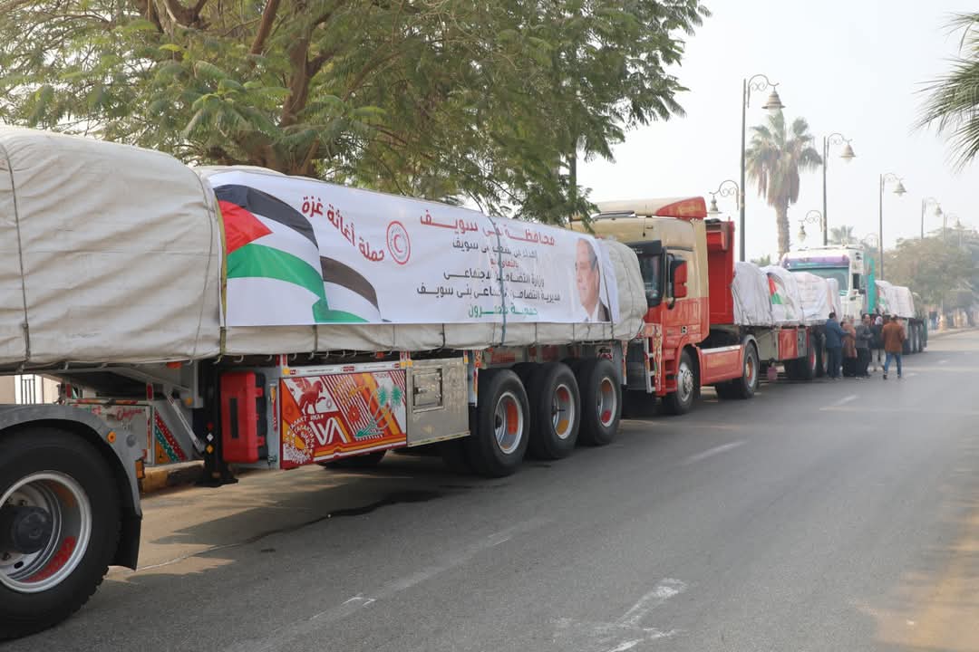 انطلاق قافلة إغاثية من بني سويف لدعم غزة.. وطفلة تلفت الأنظار برسالة مؤثرة