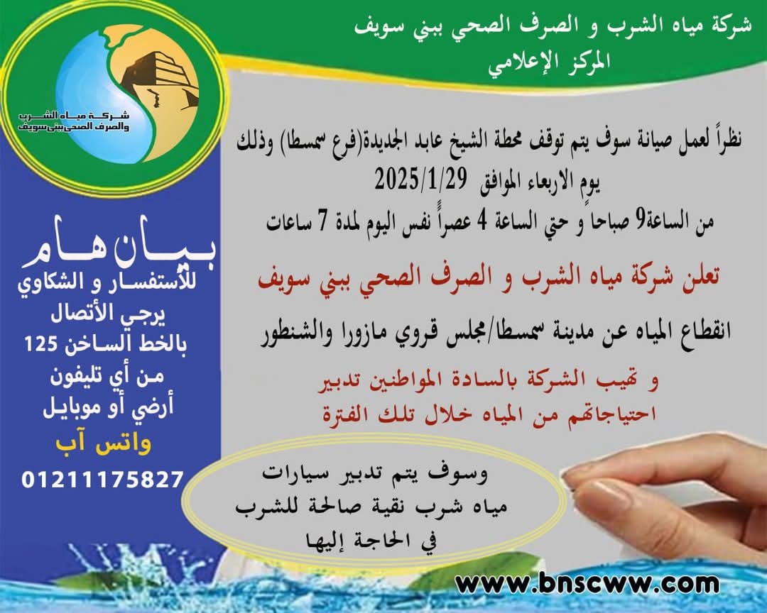 أعلنت شركة مياه الشرب والصرف الصحي بمحافظة بني سويف، أنه تقرر قطع المياه عن مدينة سمسطا وقرى الشنطور، ومازورة، لمدة 7 ساعات، غدا الأربعاء 29 يناير الجاري، اعتبارًا من الساعة 9 صباحًا حتى 4 عصرًا، بسبب أعمال صيانة بمحطة الشيخ عابد الجديدة.