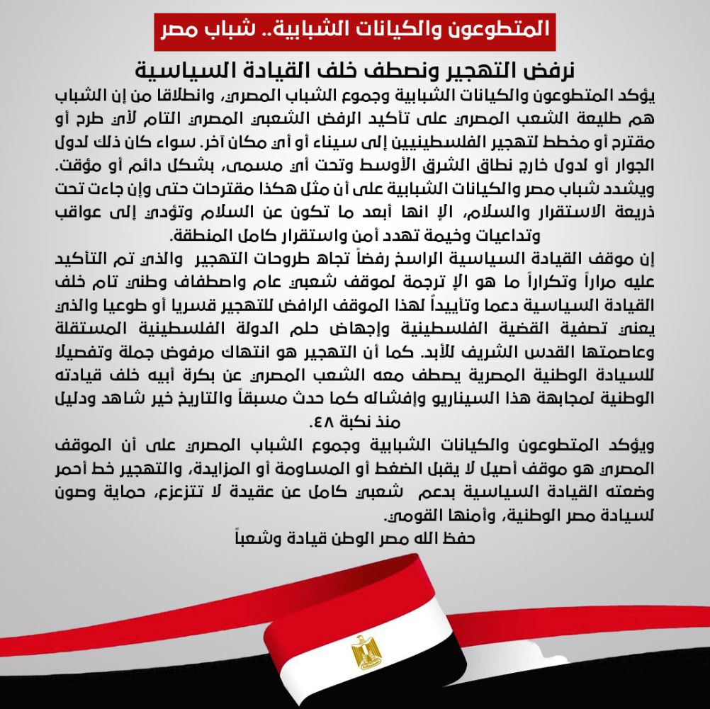 أكد المتطوعون والكيانات الشبابية وجموع الشباب المصري، وانطلاقا من إن الشباب هم طليعة الشعب المصرى على تأكيد الرفض الشعبي المصري التام لأي طرح أو مقترح أو مخطط لتهجير الفلسطينيين إلى سيناء أو أي مكان آخر. سواء كان ذلك لدول الجوار أو لدول خارج نطاق الشرق الأوسط وتحت أي مسمى، بشكل دائم أو مؤقت. ويشدد شباب مصر والكيانات الشبابية على أن مثل هكذا مقترحات حتى وإن جاءت تحت ذريعة الاستقرار والسلام الا انها أبعد ما تكون عن السلام وتؤدي إلى عواقب وتداعيات وخيمة تهدد أمن واستقرار كامل المنطقة.