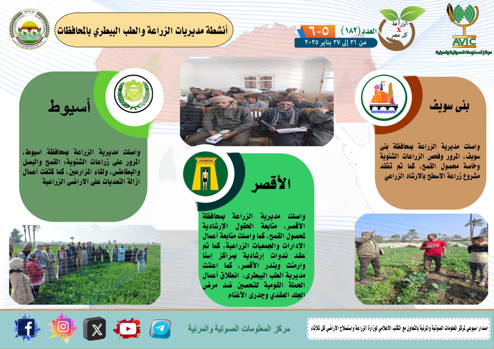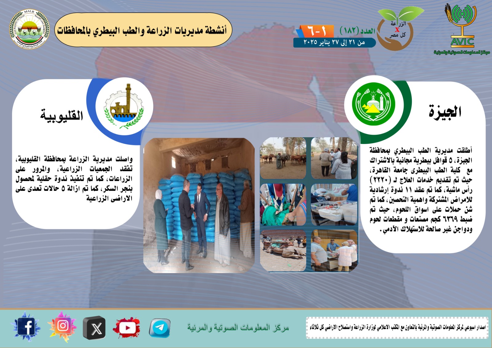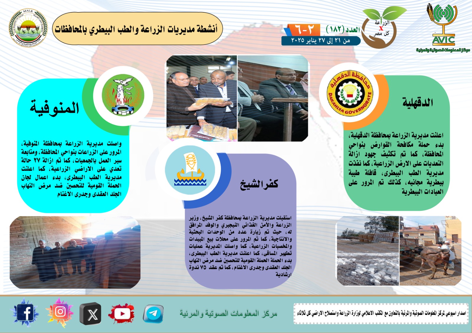 أصدر مركز المعلومات الصوتية والمرئية التابع لوزارة الزراعة واستصلاح الأراضي، والمكتب الاعلامي للوزارة، العدد رقم 182 من اصدار: "الزراعة في كل مصر" بالانجراف والفيديو، يوضح الجهود والانشطة التي تقوم بها مديريات الزراعة والطب البيطري بمحافظات الجمهورية خلال الفترة من 21 وحتى 27 يناير الجاري.