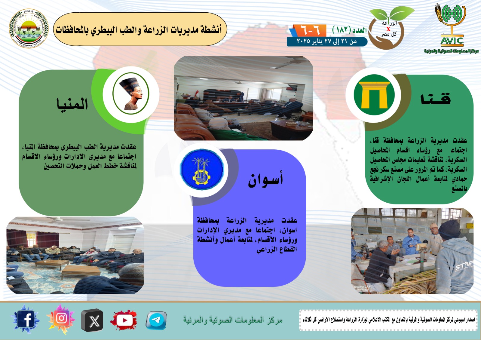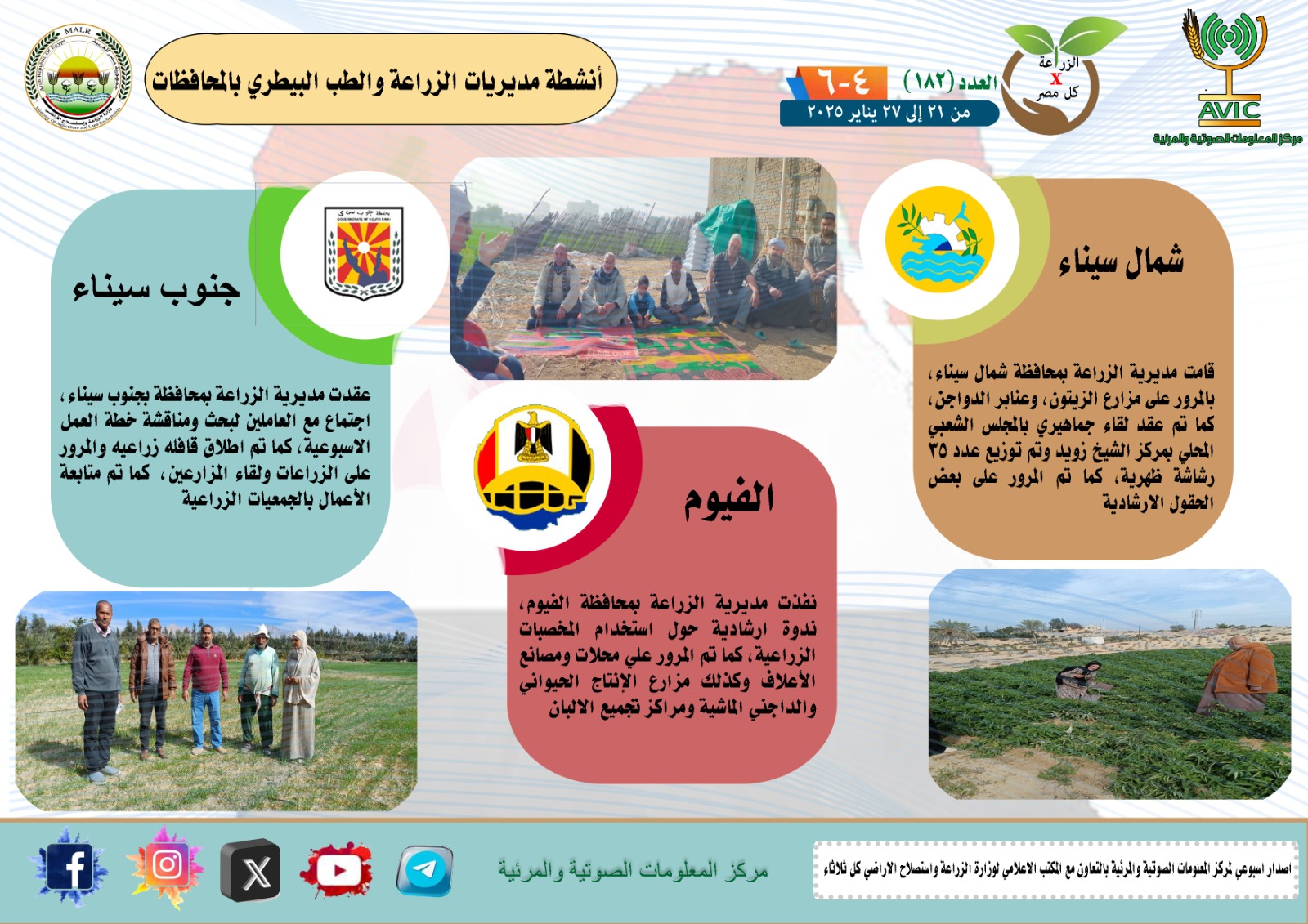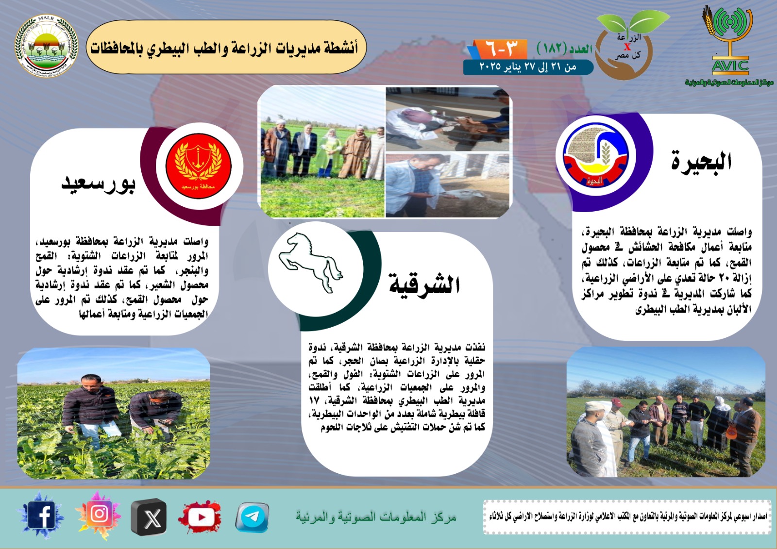 أصدر مركز المعلومات الصوتية والمرئية التابع لوزارة الزراعة واستصلاح الأراضي، والمكتب الاعلامي للوزارة، العدد رقم 182 من اصدار: "الزراعة في كل مصر" بالانجراف والفيديو، يوضح الجهود والانشطة التي تقوم بها مديريات الزراعة والطب البيطري بمحافظات الجمهورية خلال الفترة من 21 وحتى 27 يناير الجاري.