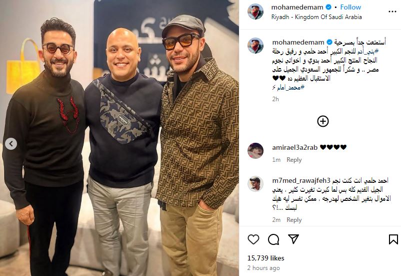 ونشر محمد إمام صورة له برفقة أحمد حلمي عبر صفحته الرسمية "إنستجرام" وعلق عليها " استمتعت جداً بمسرحية بني آدم للنجم الكبير أحمد حلمي و رفيق رحلة النجاح المنتج الكبير أحمد بدوي و اخواتي نجوم مصر ، و شكراً للجمهور السعودي الجميل على الاستقبال العظيم ده ".