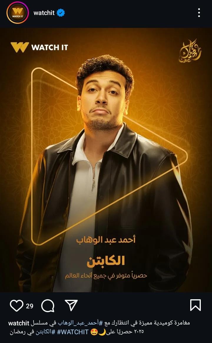 ونشرت المنصة الرقمية Watch it البوستر التشويقي للفنان أحمد عبد الوهاب في مسلسل الكابتن بطولة أكرم حسني، وذلك من خلال حسابها الرسمي علي موقع تبادل الصور والفديوهات القصيرة “إنستجرام” معلقا: “ مغامرة كوميدية مميزة في انتظارك مع أحمد عبد الوهاب في مسلسل الكابتن، في رمضان 2025 حصريًا علي Watch it”.