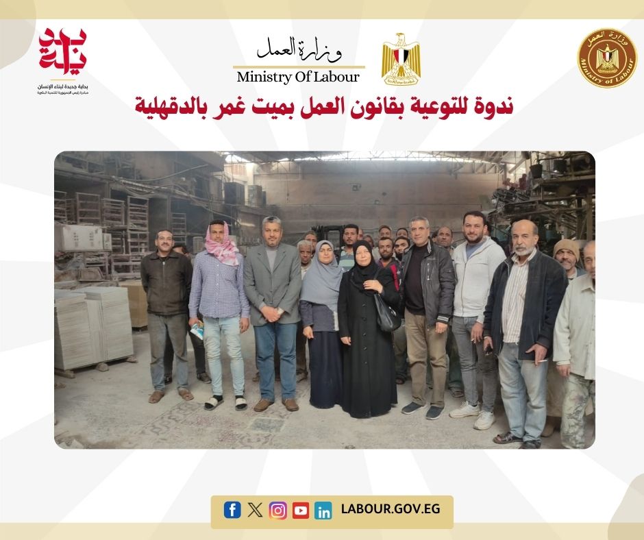 عقد مكتب عمل ميت غمر التابع لمديري العمل بالدقهلية ندوة للتوعية بقانون العمل ١٢ لسنة ٢٠٠٣، وذلك للعاملين بمصنع الصوفي للبلاط الآلي بباشالوش بميت غمر، وأوضح المستشار أحمد رجائي مدير المديرية، أن الندوة تأتي تنفيذاً لتوجيهات السيد محمد جبران وزير العمل بضرورة توعية العمال بحقوقهم وواجباتهم التي أقرها القانون، حيث ناقشت الندوة أبرز تلك الحقوق والواجبات ومنها (صيغة عقد العمل الصحيح وما يشترط أن يتضمنه من بيانات وعدم وجود بنود تخالف صحيح القانون ولو باتفاق الطرفين، إلى جانب توضيح عدد ساعات العمل طبقا للقانون وكيفية التشغيل الإضافي ومبرراته وكيفية احتساب الأجر الخاص به، كما تم إيضاح كيفية الحصول على الإجازات للعمال ومدتها وواجبات العمال،جاء ذلك بحضور أمل البدري مدير المنطقة، خالد غيث مدير المكتب ومها عبد الحفيظ مفتش المكتب.