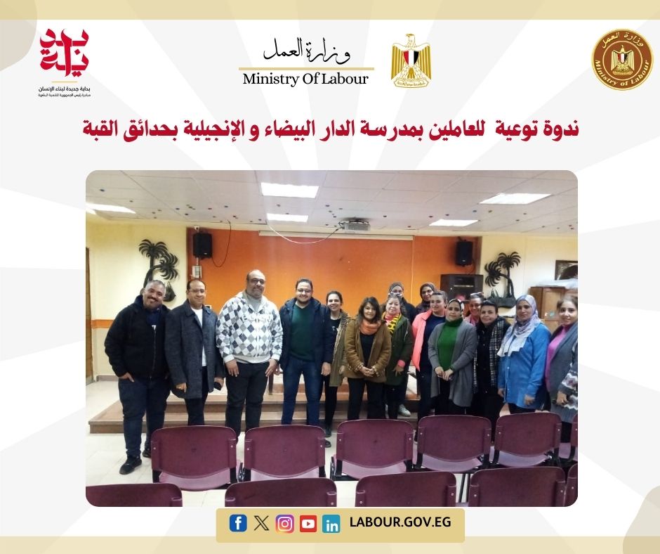 عقدت مديرية العمل بالقاهرة ندوة توعوية تحت شعار سلامتك تهمنا، لعدد 13 عامل بمقر مدرسة الدار البيضاء والإنجيلية، وذلك من خلال مكتب السلامة والصحة المهنية بحدائق القبة.
