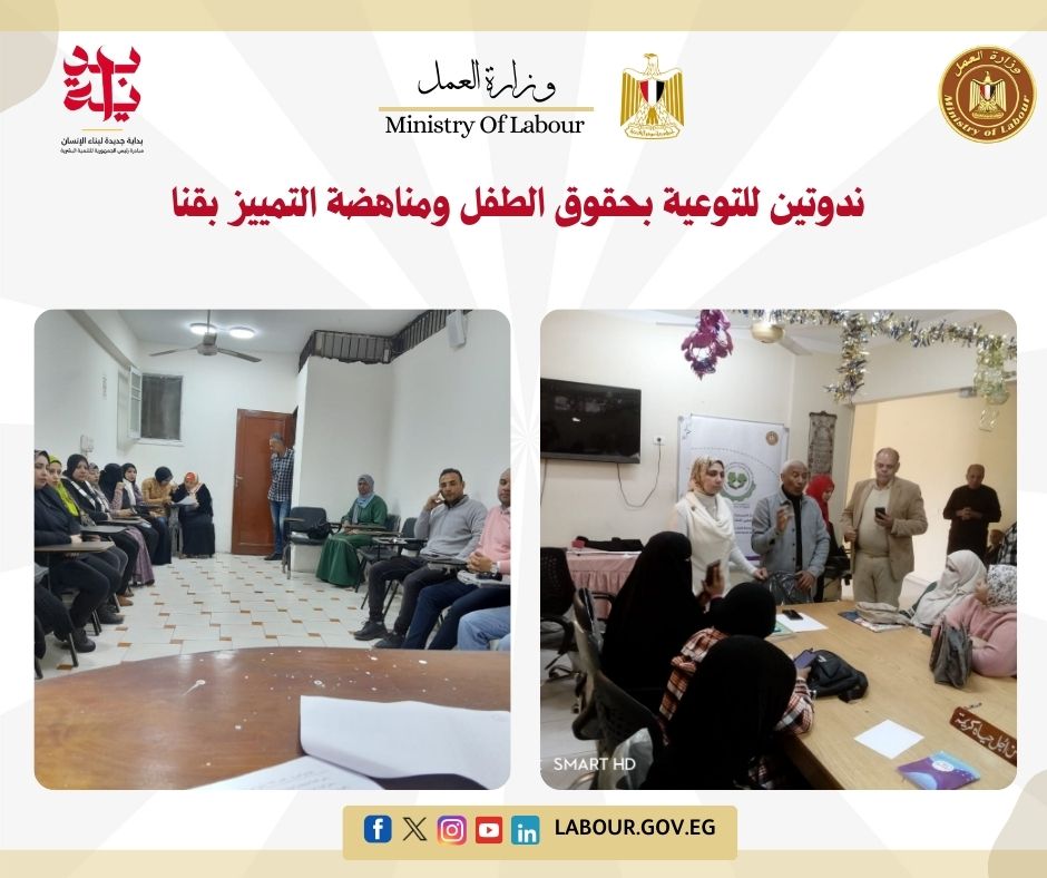 عقدت مديرية العمل بقنا ندوة للتوعية بالقرار الوزاري رقم 215 لسنة 2021 بجمعية نادي رجال الأعمال بمدينة نجع حمادي، وذلك بحضور هدى عبد الله، مسئول الطفل، والتي قدمت شرحا وافيا حول أهمية القرار وأهدافه ودوره في حماية حقوق الطفل في بيئة العمل، كما نظمت المديرية ندوة بوحدة التدريب الثابتة بمدينة نجع حمادي للتعريف بإتفاقية منظمة العمل الدولية رقم 111 والخاصة بمناهضة التمييز في الاستخدام والمهنة، والتي حاضرت فيها حسناء حسن مسئول المرأة، حيث تناولت الجوانب المختلفة للاتفاقية وأهمية تحقيق المساواة وعدم التمييز في بيئة العمل.وأوضح أحمد جابر عبد الباسط مدير المديرية أن تلك الفعاليات تأتي ضمن الجهود وزارة العمل والمديرية لتعزيز التوعية بالحقوق والواجبات العمالية، بما يسهم في تحسين بيئة العمل وتحقيق العدالة والمساواة في سوق العمل.