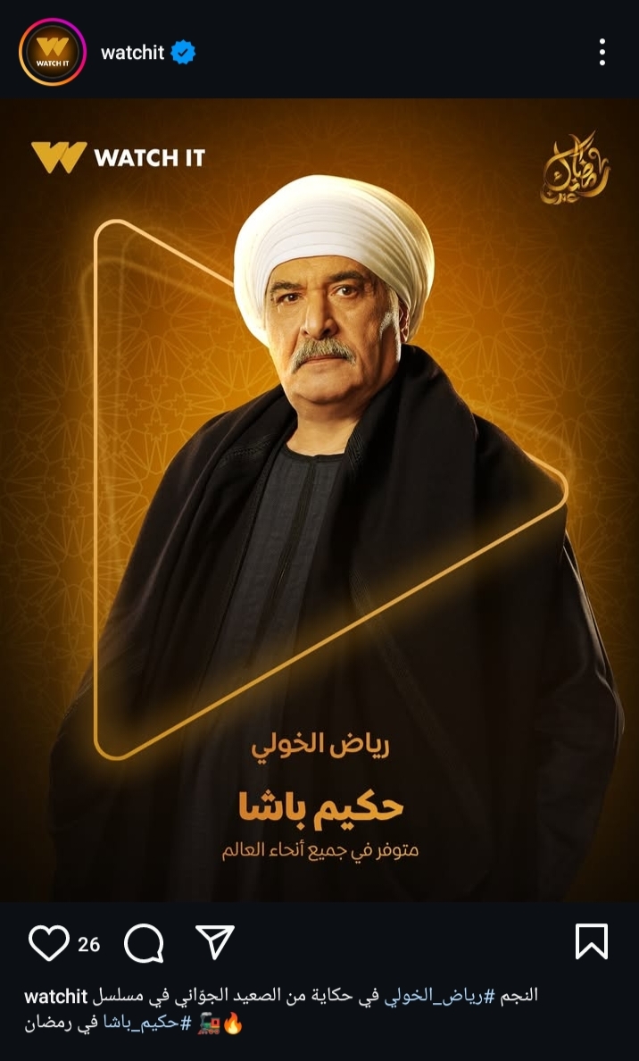 وطرحت Watch it البوستر الخاص بـ رياض الخولي من خلال حسابها الرسمي علي موقع تبادل الصور والفديوهات القصيرة “إنستجرام” معلقا: “النجم رياض الخولي في حكاية من الصعيد الجواني في مسلسل حكيم باشا في رمضان 2025”.