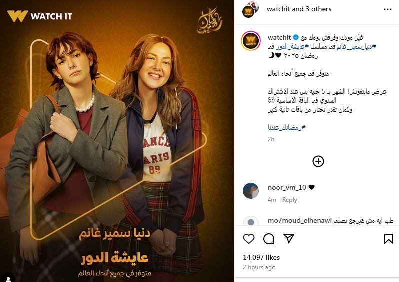روجت منصة watch it لمسلسل دنيا سمير غانم "عايشة الدور" والذي من المقرر عرضه خلال شهر رمضان المقبل 2025.