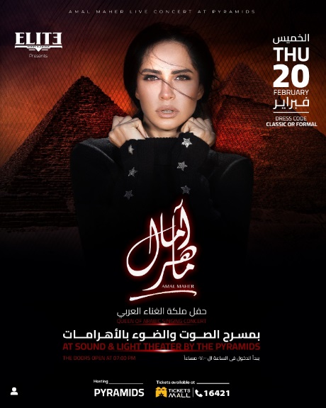 أعلنت النجمة أمال ماهر عن حفلها الغنائي المقبل على مسرح الصوت والضوء في أهرامات الجيزة يوم الخميس 20 فبراير المقبل.