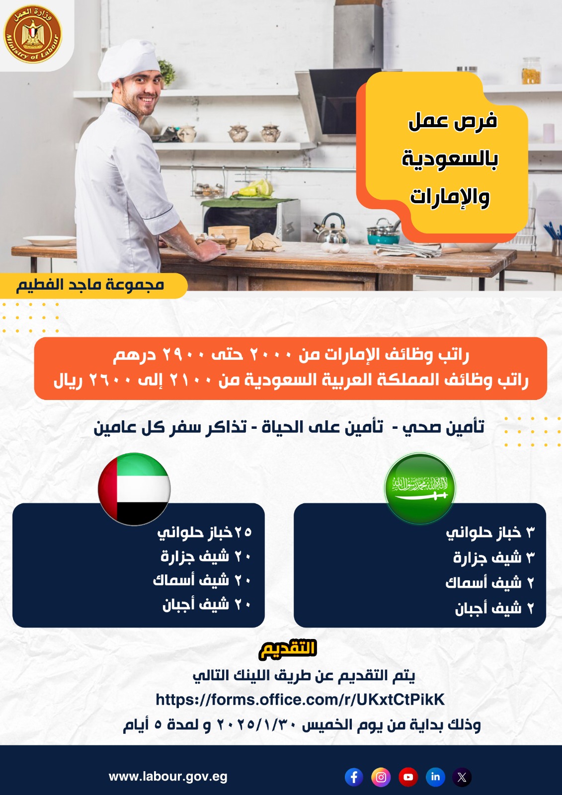وأوضح الوزير أن الفرص المطلوبة لمجموعة ماجد الفطيم للعمل بالسعودية بالتخصصات الأتية: عدد 3 خباز حلواني، عدد 3 شيف جزارة، عدد 2 شيف أجبان، عدد 2 شيف أسماك، برواتب تتراوح ما بين 3100 و 3600 ريال سعودي، والوظائف المطلوبة بدولة الإمارات العربية بالتخصصات الأتية: عدد 25 خباز حلواني، عدد 20 شيف جزارة، عدد 20 شيف أجبان، وعدد 20 شيف أسماك، برواتب تتراوح ما بين 3000 و 3900 درهم إماراتي .