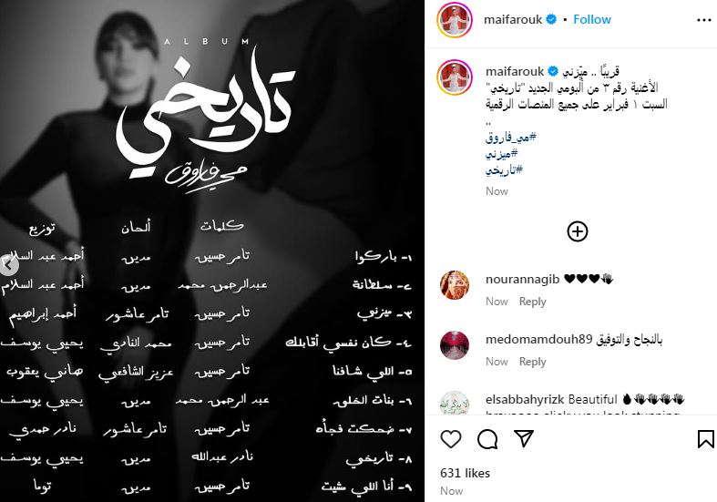 ونشرت مي عبر صفحتها الرسمية "إنستجرام"أسامي أغاني الالبوم وأعلنت عن طرح الأغنية الثالثة من الألبوم وقالت مي " قريبأ ميزني ،الأغنية رقم ٣ من ألبومي الجديد "تاريخي"،السبت ١ فبراير على جميع المنصات الرقمية".