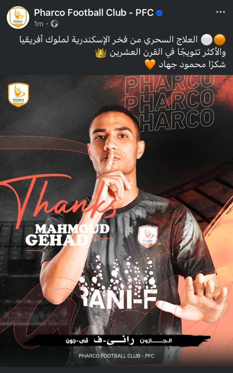 ونشر الحساب الرسمى لنادى فاركو رسالة وداعية للاعب عبر وسائل التواصل الاجتماعي، جاءت كالتالي : "العلاج السحرى من فخر الإسكندرية لملوك أفريقيا والأكثر تتويجًا فى القرن العشرين شكرًا محمود جهاد".