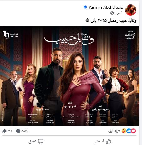 تواصل الفنانة ياسمين عبد العزيز الترويج لمسلسلها الجديد "وتقابل حبيب"والمقرر عرضه في رمضان 2025.