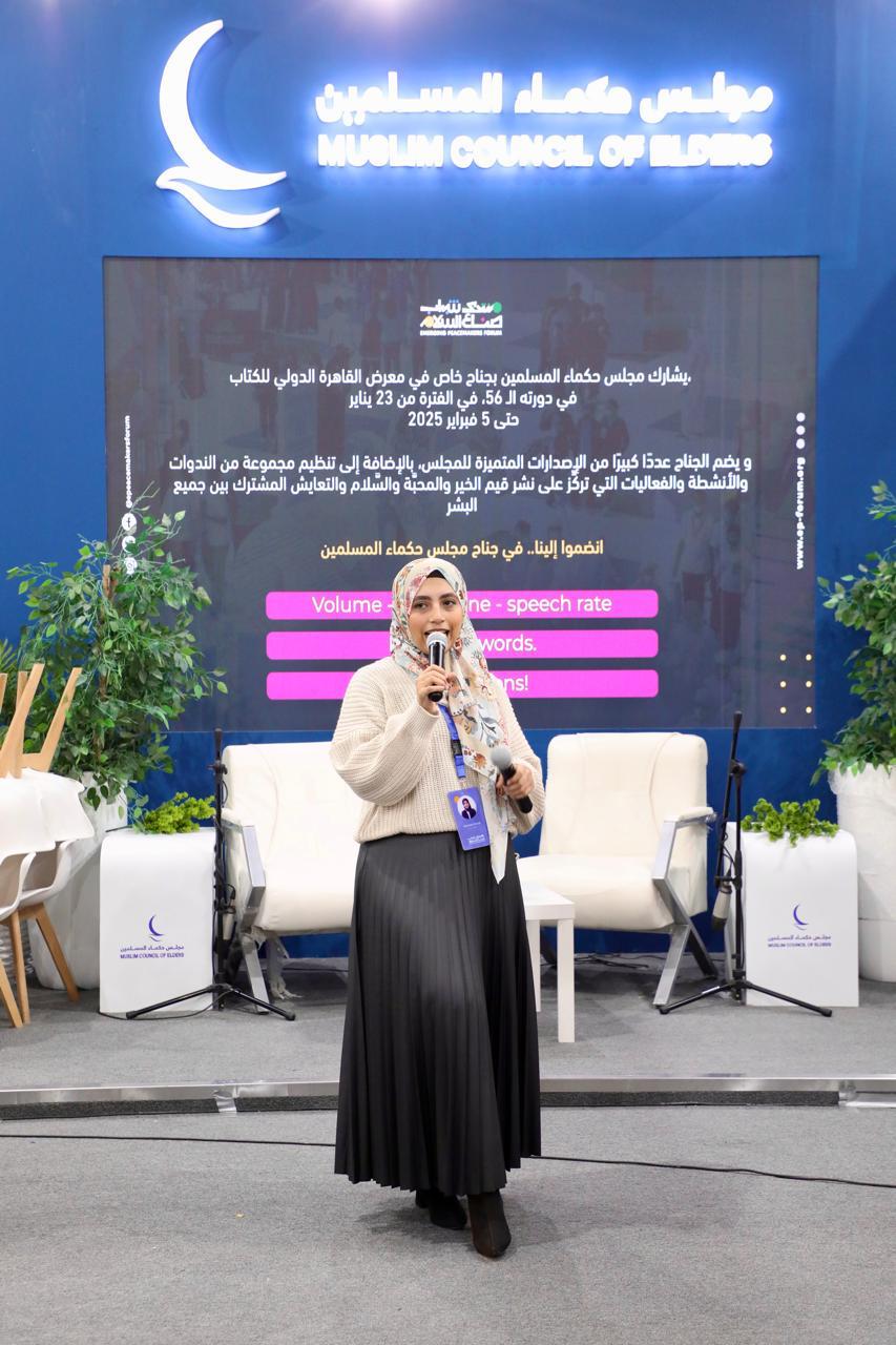 نظَّم منتدى شباب صنَّاع السلام، إحدى المبادرات الرائدة لمجلس حكماء المسلمين، ورشة تدريبية بعنوان "استخدم صوتك في التواصل الفعَّال"، قدمتها ياسمين عبيد، خريجة منتدى شباب صناع السلام، وذلك في جناح مجلس حكماء المسلمين بمعرض القاهرة الدولي للكتاب.