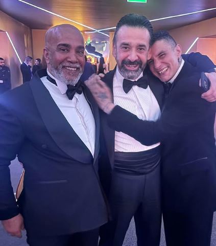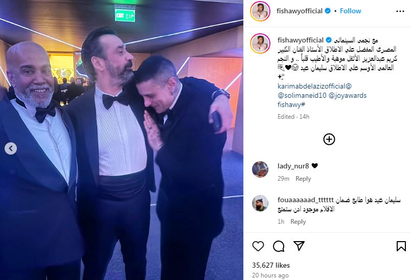 وكتب الفيشاوي علي الصور " مع نجمى السينمائى المصرى المفضل على الاطلاق الأستاذ الفنان الكبير كريم عبدالعزيز الأثقل موهبة والأطيب قلباً .. و النجم العالمى الأوسم على الإطلاق سليمان عيد".