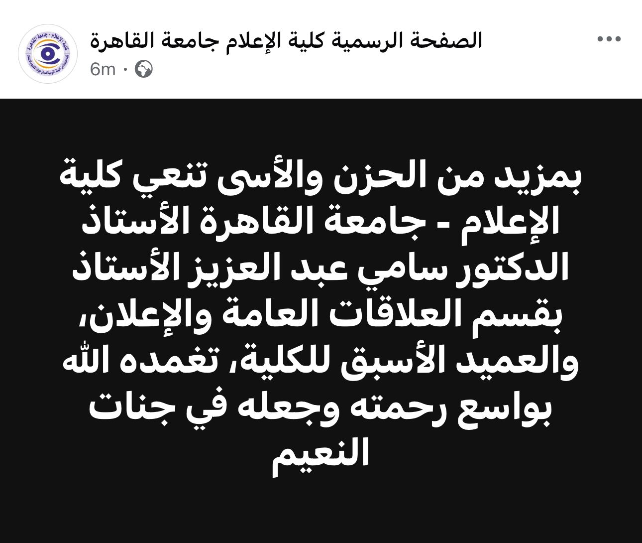 وجاء في منشور الصفحة الرسمية لكلية الإعلام بجامعة القاهرة التالي: بمزيد من الحزن والأسى تنعي كلية الإعلام جامعة القاهرة الأستاذ الدكتور سامي عبد العزيز الخبير الإعلامي الكبير، الأستاذ بقسم العلاقات العامة والإعلان والعميد الأسبق للكلية، تغمده الله بواسع رحمته وجعله في جنات النعيم
