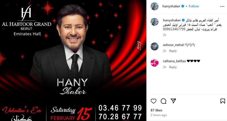 ونشرت الصفحة الرسمية للنجم هاني شاكر عبر "إنستجرام" البوستر الدعائي للحفل وعلقت عليه " أمير الغناء العربي هاني شاكر يغني " الحب" مساء السبت ١٥ فبراير اوتيل الحبتور غراند بيروت- لبنان".