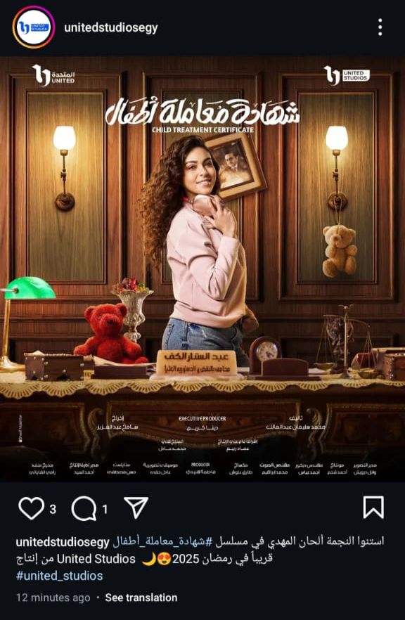 ونشرت الشركة المنتجة البوستر الفردي لـ ألحان المهدي من خلال حسابها الرسمي عبر " إنستجرام" معلقا: “ استنوا الحان المهدي في مسلسل شهادة معاملة أطفال من إنتاج United studios قريبًا في رمضان 2025”.