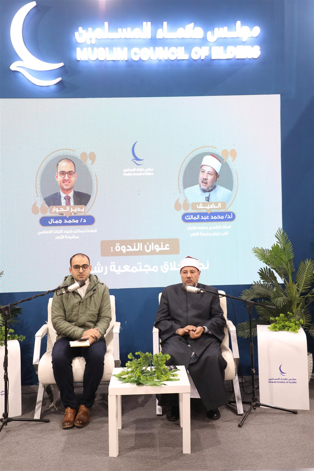 عقد جناح مجلس حكماء المسلمين، بمعرض القاهرة الدولي للكتاب، ندوتَه الثقافية الثامنة عشرة بعنوان: "نحو أخلاق مجتمعية رشيدة"، بمشاركة الدكتور محمد عبد المالك، أستاذ التفسير وعلوم القرآن، نائب رئيس جامعة الأزهر، أدار الندوة الدكتور محمد جمال، الباحث بمكتب إحياء التراث الإسلامي بمشيخة الأزهر.