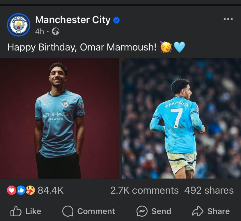 احتفلت الصفحة الرسمية لنادي مانشستر سيتي عبر فيسبوك، باللاعب الدولي عمر مرموش المنضم حديثا لصفوف الفريق، بمناسبة عيد ميلاده.