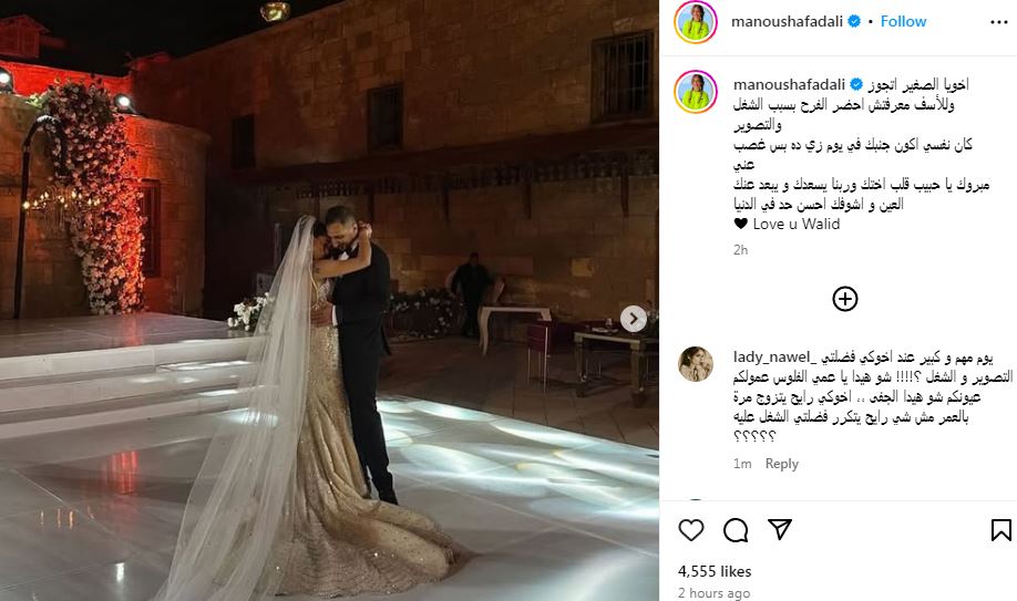 ونشرت منة صورة من حفل زفاف شقيقها الأصغر عبر صفحتها الرسمية "إنستجرام" وعلقت عليها " اخويا الصغير اتجوز وللاسف معرفتش احضر الفرح بسبب الشغل والتصوير، كان نفسي اكون جنبك في يوم زي ده بس غصب عني، مبروك يا حبيب قلب اختك وربنا يسعدك و يبعد عنك العين و اشوفك احسن حد في الدنيا".