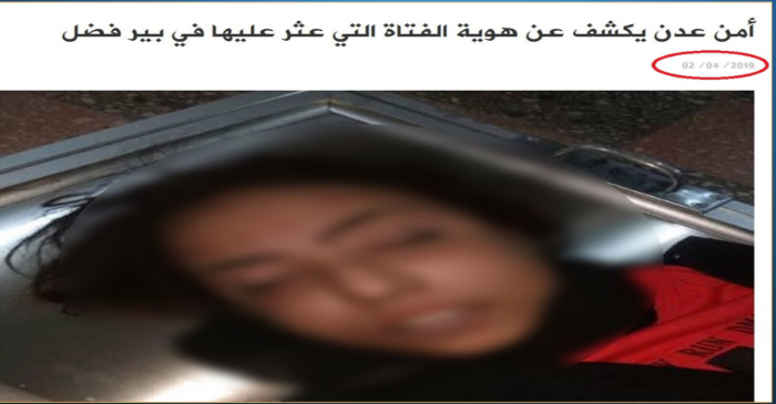 وأكد المصدر أن المنشور المشار إليه "قديم" سبق تداوله بتاريخ 2 إبريل 2019 بعدد من المواقع الإخبارية الخاصة بدولة اليمن، وأن جهات التحقيق اليمنية كشفت عن هوية الفتاة المشار إليها وملابسات الواقعة آنذاك .
