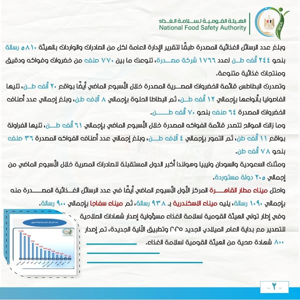 وفي إطار تولي الهيئة القومية لسلامة الغذاء مسؤولية إصدار شهادات الصلاحية للتصدير مع بداية العام الميلادي الجديد 2025 وتطبيق الآلية الجديدة، تم إصدار 800 شهادة صحية من الهيئة القومية لسلامة الغذاء.