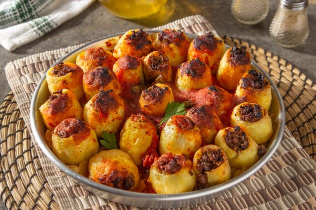 - تُحشى البطاطس بخليط اللحم المفروم وترص في صينية بايركس.