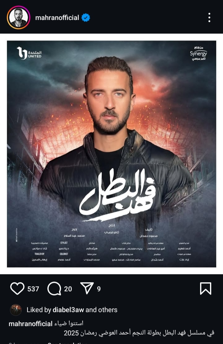 ونشر محمد مهران البوستر الفردي له في مسلسل فهد البطل بطولة أحمد العوضي، من خلال حسابه الرسمي عبر موقع تبادل الصور والفديوهات القصيرة "إنستجرام" وعلق: “ استنوا ضياء في مسلسل فهد البطل بطولة النجم أحمد العوضي رمضان 2025”.