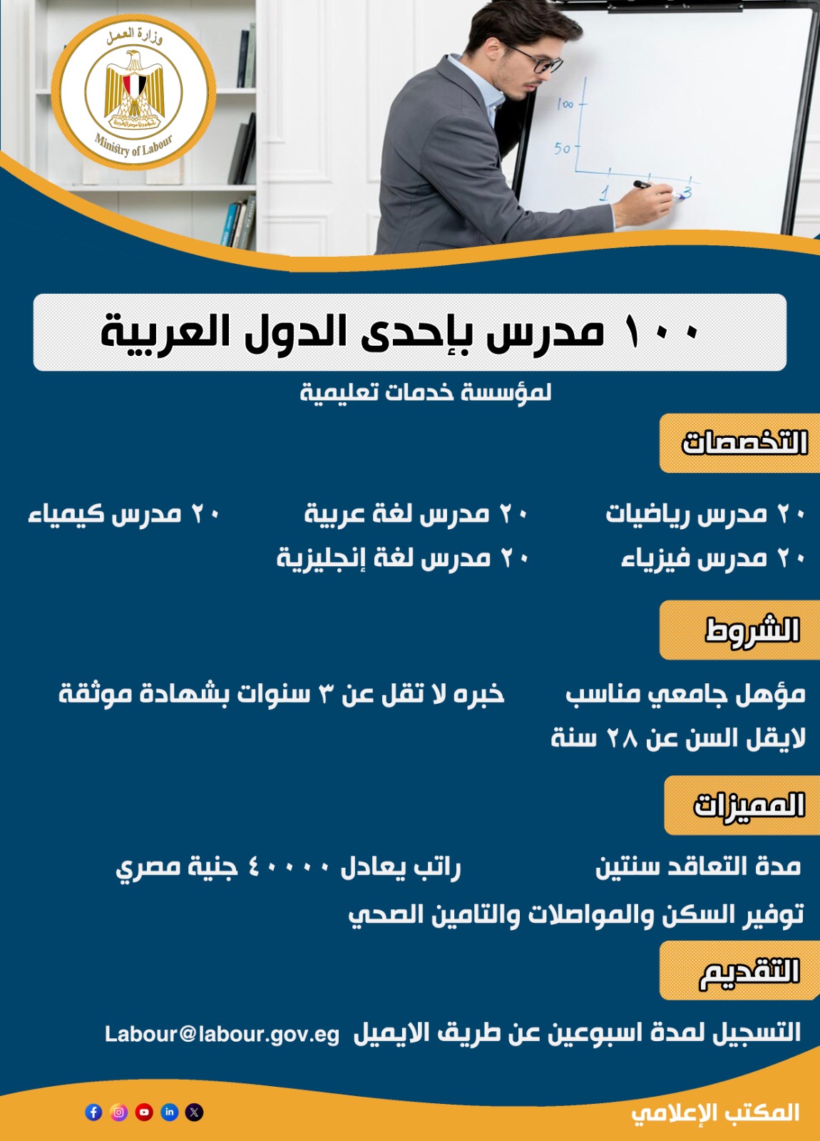 أعلن وزير العمل محمد جبران عن توفير 100 فرصة عمل على وظائف مختلفة بمؤسسة خدمات تعليمية بإحدى الدول العربية، وذلك بمرتب شهري يعادل 40 ألف جنيه مصري.