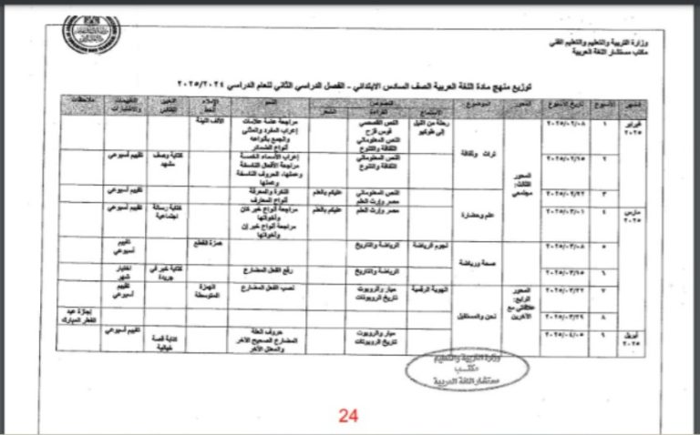 أعلنت وزارة التربية والتعليم والتعليم الفني عن تفاصيل توزيع منهج اللغة العربية الصف السادس الابتدائي الترم الثاني 2025، وذلك ضمن خريطة توزيع المناهج الدراسية للفصل الدراسي الثاني.