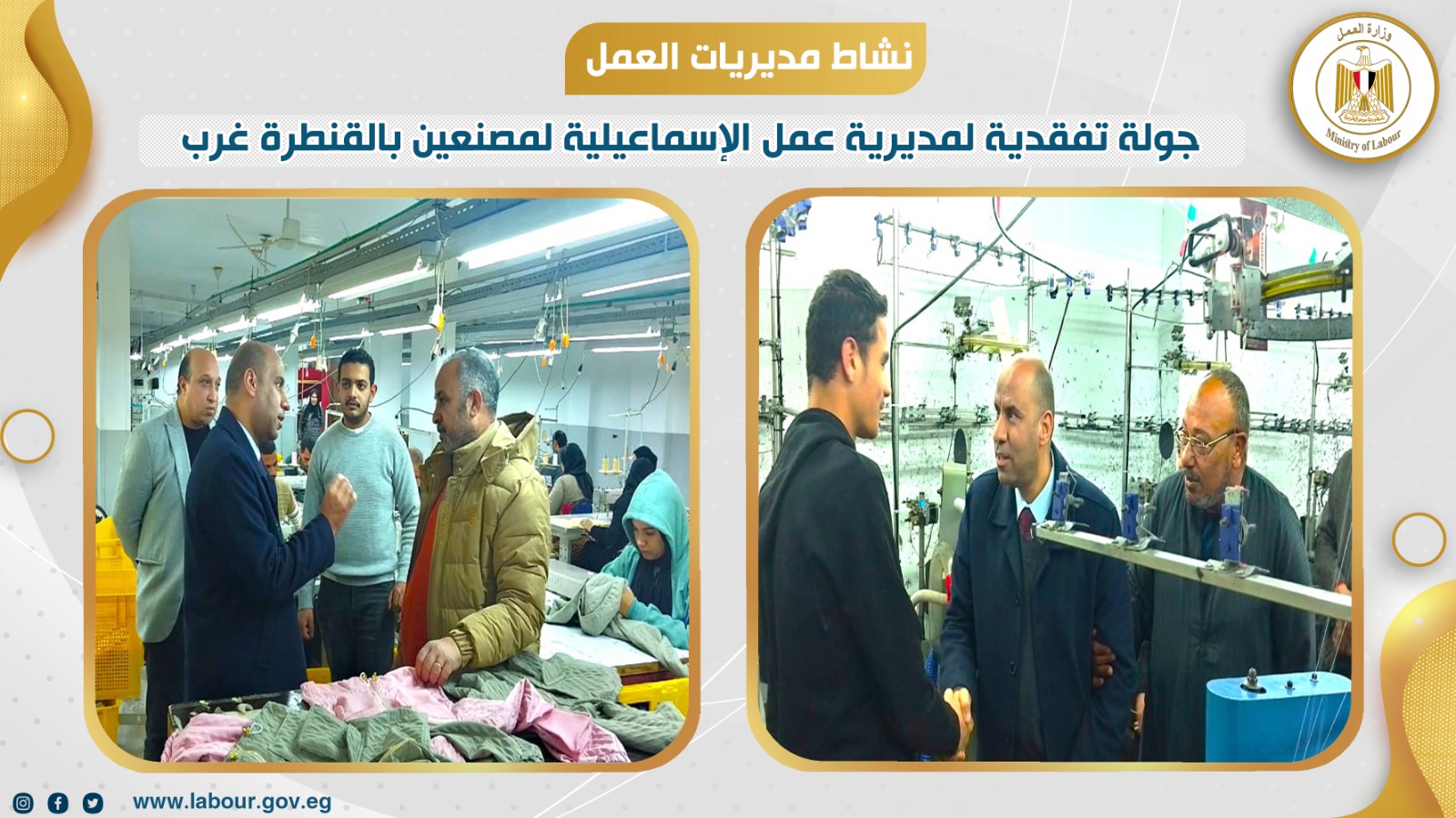 نظمت مديرية العمل بمحافظة الإسماعيلية جولة ميدانية لعدد من المصانع بمدينة القنطرة غرب، شملت تفقد مصنع الكاراس للملابس الجاهزة ومصنع المصطفى لصناعة الجوارب، وذلك للتأكد من تطبيق أحكام قانون العمل رقم 12 لسنة 2003 ، فيما يخص تشغيل ذوي الهمم وتطبيق الحد الأدنى للأجور بالإضافة إلى المساواة بين الجنسين ووجود اشتراطات السلامة والصحة المهنية وتعزيز علاقات العمل بين طرفي العملية الإنتاجية.