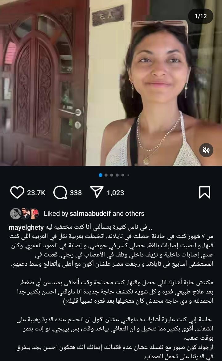 وغابت الفنانة مي الغيطي عن الساحة الفنية و مواقع التواصل الإجتماعي فترة كبير، الأمر الذي اثار قلق الجمهور عليها، لتكشف بعد 7 شهور من غيابها عن السبب و تشارك جمهورها صور من الحادث الذي تعرضت له في تايلاند.