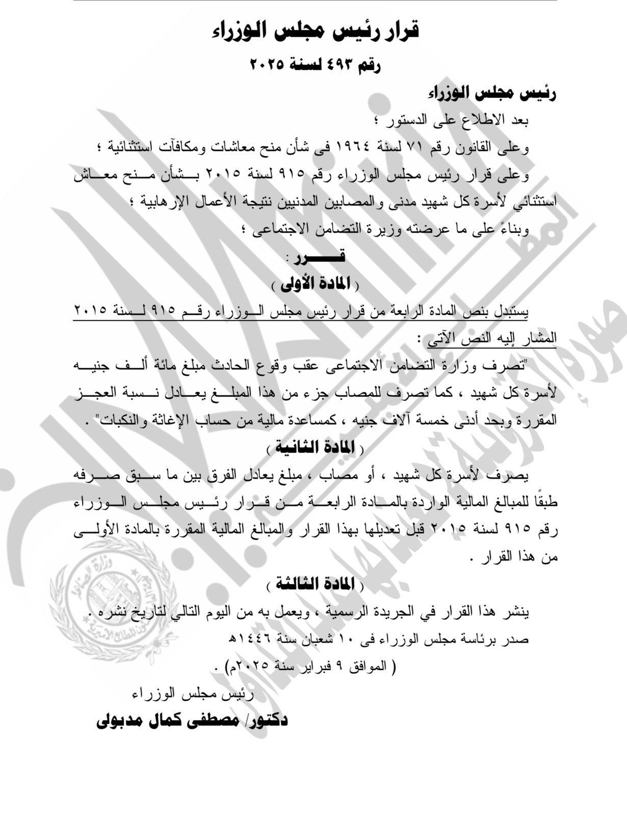 أصدر الدكتور مصطفى مدبولى، رئيس الوزراء ، قرار بأن تصرف وزارة التضامن الاجتماعي عقب وقوع حادث إرهابي 100 ألف جنيه لأسرة كل شهيد".