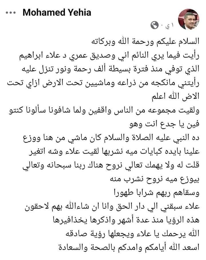 وجاء نص المنشور الذي قام الدكتور الراحل بنشره أمس على حسابه بموقع التواصل الاجتماعي "الفيس بوك" كالأتي: "السلام عليكم ورحمة الله وبركاته.. رأيت فيما يرى النائم أني وصديق عمري د علاء إبراهيم الذي توفي منذ فترة بسيطة ألف رحمة ونور تنزل عليه.. رأيتني مأنكجه من ذراعه وماشيين تحت الأرض إزاي تحت الأرض الله أعلم، ولقيت مجموعة من الناس واقفين ولما شافونا سألونا كنتوا فين يا جدع أنت وهو، ده النبي عليه الصلاة والسلام كان ماشي من هنا ووزع علينا بإيده كبايات ميه نشربها لقيت علاء وشه اتغير، قلت له ولا يهمك تعالى نروح هناك ربنا سبحانه وتعالى بيوزع ميه نروح نشرب منه.. وسقاهم ربهم شرابا طهورا، علاء سبقني إلى دار الحق وأنا إن شاء الله بهم لاحقون، هذه الرؤيا منذ عدة أشهر وأذكرها بحذافيرها، الله يرحمك يا علاء ويجعلها رؤية صادقة.. اسعد الله أيامكم وأمدكم بالصحة والسعادة".