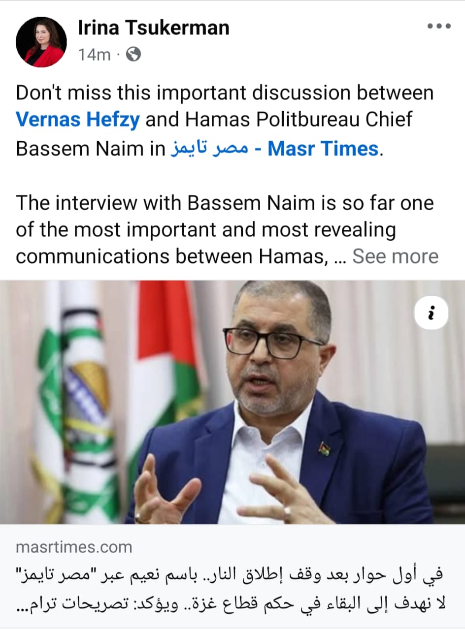 أثنت إيرينا تسوكرمان محامي الأمن القومي الأمريكي وعضو إدارة واشنطن الخارجي لحرب المعلومات، بانفراد "مصر تايمز" بحوار الدكتور باسم نعيم رئيس الدائرة السياسية والعلاقات الخارجية في حركة حماس وعضو المكتب السياسي ووزير الصحة الفلسطيني السابق.