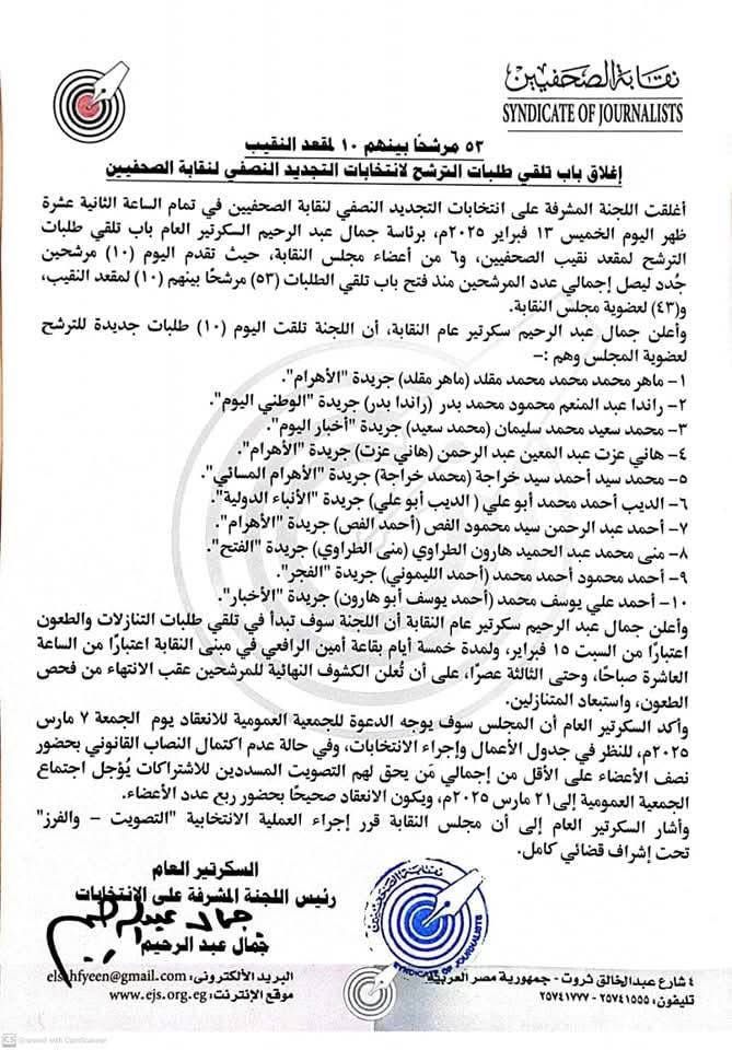 أغلقت اللجنة المشرفة على انتخابات التجديد النصفي لنقابة الصحفيين في تمام الساعة الثانية عشرة ظهر اليوم الخميس 13 فبراير 2025م، برئاسة جمال عبد الرحيم السكرتير العام باب تلقي طلبات الترشح لمقعد نقيب الصحفيين، و6 من أعضاء مجلس النقابة، حيث تقدم اليوم ( 10) مرشحين جُدد ليصل إجمالي عدد المرشحين منذ فتح باب تلقي الطلبات (53) مرشحًا بينهم (10) لمقعد النقيب، و(43) لعضوية مجلس النقابة.
