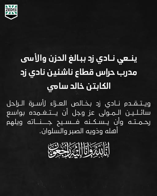 ينعي نادي زد ومجلس إدارته وفاة خالد سامي مدرب حراس المرمى لقطاع الناشئين، وكان قد تعرض خالد سامي، في وقت سابق، لحادث مروري، أدى إلى تفحم سيارته وتعرضه لعدة إصابات خطيرة، قبل أن يتم نقله إلى أحد المستشفيات.