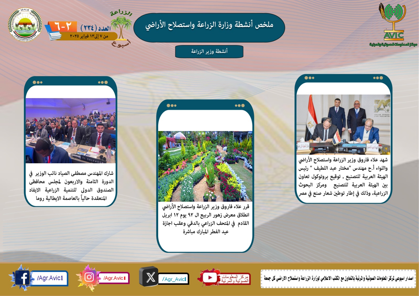 أصدر مركز المعلومات الصوتية والمرئية، التابع لوزارة الزراعة واستصلاح الاراضي، "الانفوجراف الاسبوعي" في نسخته رقم ٢٣٤ حول الحصاد الاسبوعي لأهم أنشطة الوزارة، خلال الاسبوع الماضي في الفترة من ٧ وحتى ١٣ فبراير الجاري، وذلك بالتعاون مع المكتب الاعلامي للوزارة، كما أصدر المركز ايضا ملخصا بالفيديو، حول انشطة الوزارة خلال نفس الفترة.