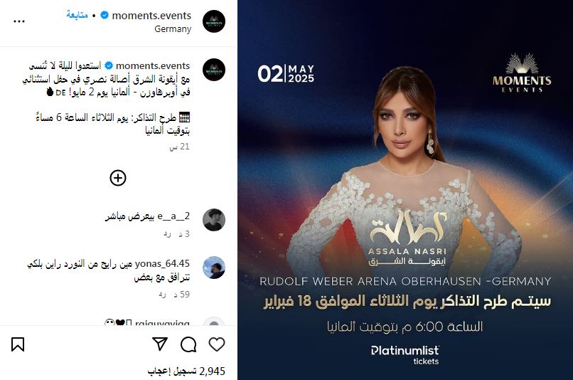 ونشرت الشركة المنظمة للحفل البوستر الدعائي للحفل عبر صفحتها الرسمية "إنستجرام" مروجة لحفلها وعلقت عليه " استعدوا لليلة لا تُنسى مع أيقونة الشرق أصالة نصري في حفل استثنائي في أوبرهاوزن - ألمانيا يوم 2 مايو! ".