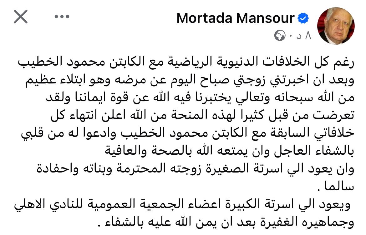 أضاف مرتضى منصور: "أعلن انتهاء كل خلافاتي السابقة مع محمود الخطيب وأدعوا له من قلبي بالشفاء العاجل وان يمتعه الله بالصحة والعافية، وأن يعود إلى أسرته الصغيرة ، وزوجته المحترمة وبناته وأحفادة سالما".